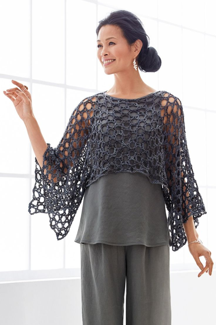 Очень мне понравилось это пончо. А знаете почему? Это перевёртыш, или трансформер. Можно носить так, как на фото, а можно перевернуть и накидка будет длиннее, но без рукавов. И от солнца прикроет, и романтический образ создаст. Здесь использован узор крючком "звезда Давида", но можно вязать любым другим узором (а также спицами или тунисским вязанием). Выкройка - прямоугольник с дыркой для головы. Ну и мастер-класс по узору (с бонусом - модной туникой)
