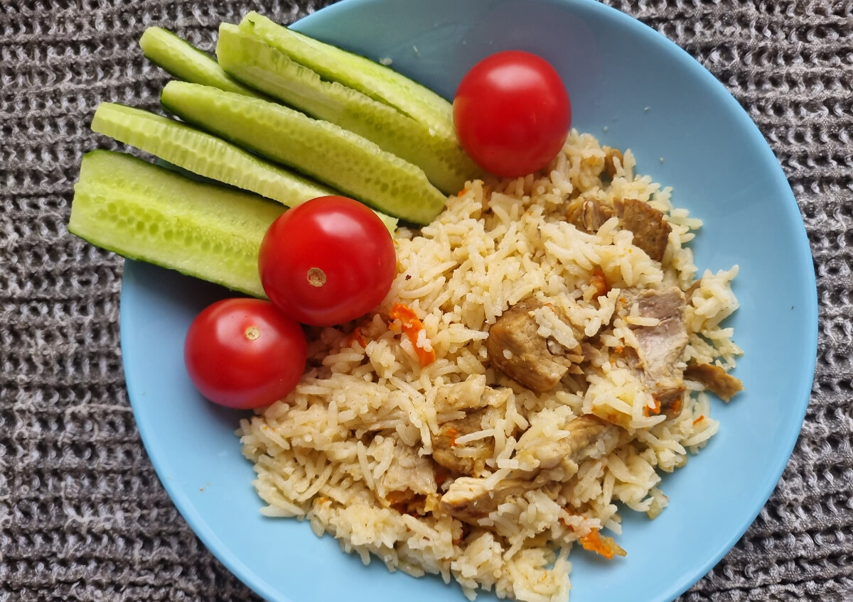 На обед был гороховый суп с тыквенными семечками и плов с овощами.
