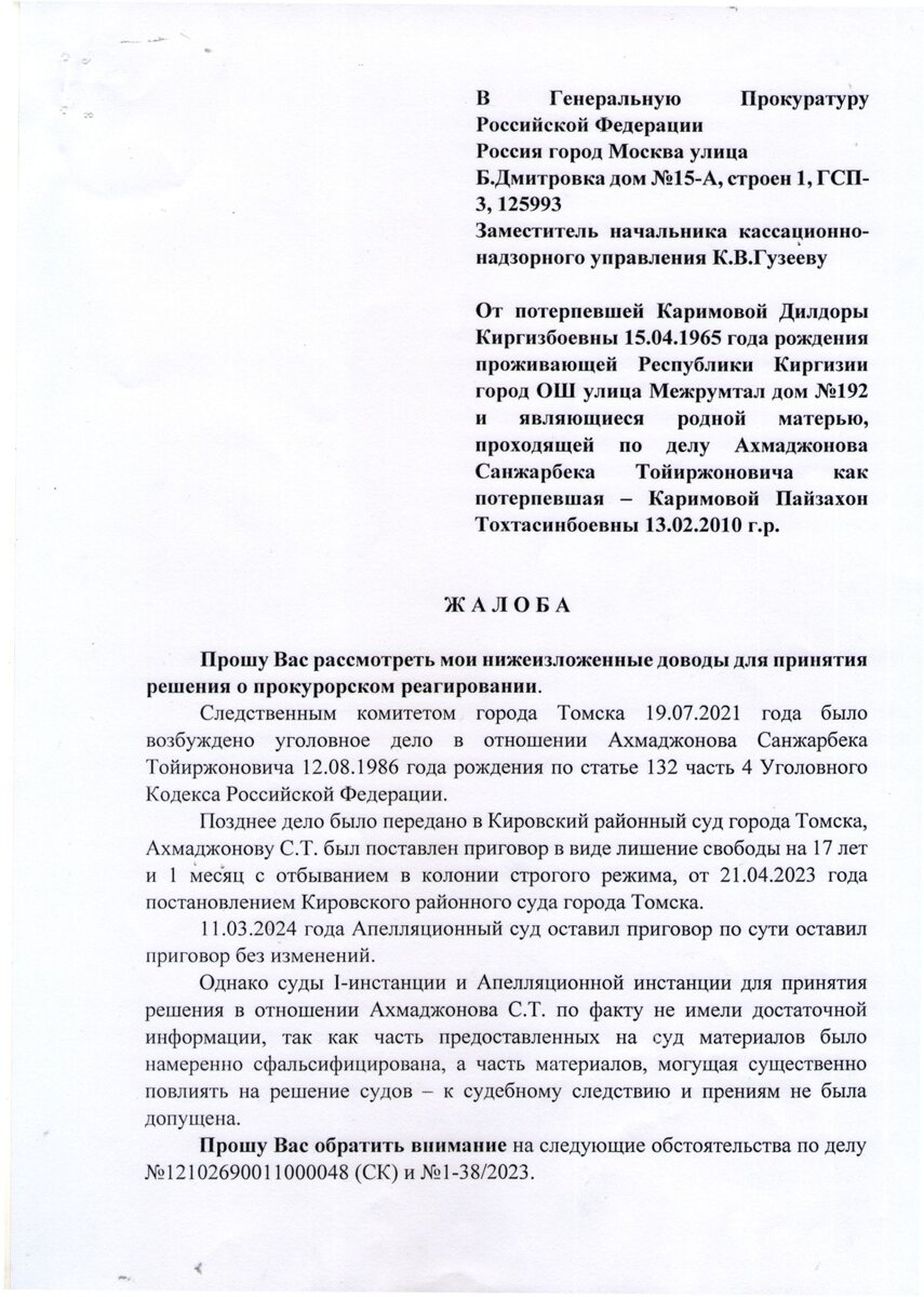 Свобода Ахмаджонова Санжарбека Тойиржоновича незаконные и необоснованные осуждения в Томске. Здравствуйте уважаемый народ. Пишу с большой надежды, я поступила не красиво, оклеветала мужа и посадила в тюрьму на 17 лет строго режима. Он Ахмаджонов Санжарбек Тойиржонович 12.08.1986 гр. Он действительно не совершал преступление предусмотренного по ст 132 часть 4 УК РФ. Я сама всем заблудила, обманула, подговорила свою сестру, сказала что она моя дочка, самом деле по факту она моя сестра. Свидетельство о рождении подтверждает что она сестра а не дочь. Ахмаджонов Санжарбек Тойиржонович женат был, у него двое детей, я за ревность отомстила не думала . помогите ему освободить, первый и второй инстанция не смотря мое заявление ходатайство и видеосообщения, а также несовершеннолетних сестра тоже заявила письменно и видеообрашения но суд специально не приняли никаких доказательств. Все экспертиза показывает что он не виновен. Ряд свидетели в суд зале дали показания но суд их тоже не учел. Город Т
