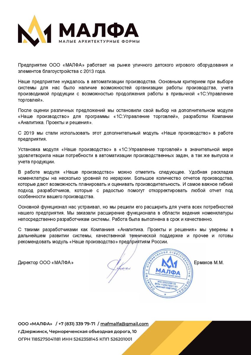 Получен очередной отзыв о модуле «Наше производство» от клиента ООО «МАЛФА» (Малые Архитектурные Формы). Предприятие ООО «МАЛФА» работает на рынке уличного детского игрового оборудования и элементов благоустройства с 2013 года. Наше предприятие нуждалось в автоматизации производства. Основным критерием при выборе системы для нас было наличие возможностей организации работы производства, учета производимой продукции с возможностью продолжения работы в привычной «1С:Управление торговлей». После оценки различных предложений мы остановили свой выбор на дополнительном модуле «Наше производство» для программы «1С:Управление торговлей», разработки Компании «Аналитика. Проекты и решения». С 2019 мы стали использовать этот дополнительный модуль «Наше производство» в работе предприятия. Установка модуля «Наше производство» в «1С:Управление торговлей» в значительной мере удовлетворила наши потребности в автоматизации производственных задач, а так же выпуска и учета продукции. В работе мо