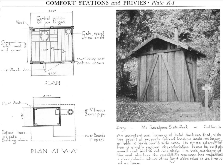 К 1935 году организация уже наработала достаточный опыт в организации отхожих мест, который можно было оценивать и описать, создав примеры планировок, которые можно было применять в последующем развитии территорий. Начнем с их терминологии. Туалеты подразделялись на два типа: "comfort station" и "privies". Privies - туалеты с выгребом, без воды и с классической "дыркой в полу"; они легко устраивались даже в наиболее глухих местах, ведь организовать подачу воды легко только тем, кто этим никогда не занимался. Comfort station - "станции комфортного пребывания" это привычные всем уборные с унитазами и водой. Они располагались на крупных узловых пунктах и относительно освоенных территориях. Оба типа строились силами службы парков из местных материалов без типовых проектов и вследствие этого имели достаточно разные конфигурации и особенно внешний вид. Большую часть отхожих мест в 30-е года составляли Privies.
