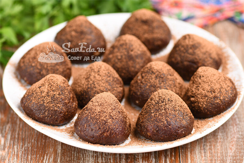 Обычно для приготовления десертов без выпечки в качестве связующей основы использую сгущенку или быстрый крем. Но в этом рецепте нет ни того, ни другого. Готовлю быструю смесь, которую все знают. Именно она дает десерту прекрасный вкус и аромат. А дополнять ее можно разными продуктами. Придавать форму пирожным можно округлую, овальную или конусовидную. Порции 450 г Время приготовления 30 минут Ингредиенты Инструкции 1. В ковш высыпаем какао-порошок, сахар и крахмал (у меня кукурузный). 2. Перемешиваем сыпучие продукты, вливаем молоко и добавляем сливочное масло. 3. Ставим ковш на средний огонь и варим помадку (глазурь), помешивая венчиком, после закипания около 1 минуты. Как глазурь загустеет, снимаем ее с огня. Убираем в холодильник, пока измельчаем грецкие орехи и печенье. 4. Грецкие орехи измельчаем в блендере и добавляем в помадку, перемешиваем. Грецкие орехи можно заменить на любые другие по вкусу. Орехи дают десерту интересный вкус. 5. Сахарное печенье, как и орехи, измельчаем