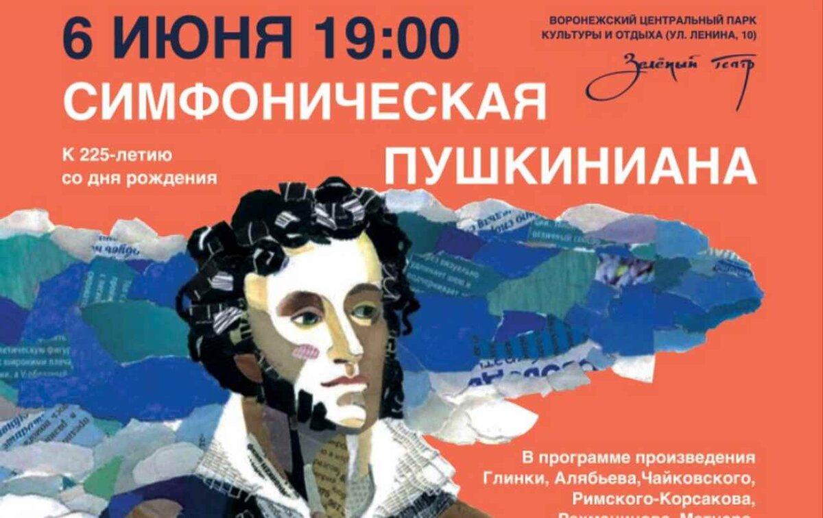 Сегодня, 6 июня, в 19 часов в Зелёном театре Воронежского Центрального парка пройдёт концерт «Симфоническая Пушкиниана» в честь 225-летия со дня рождения Александра Пушкина.