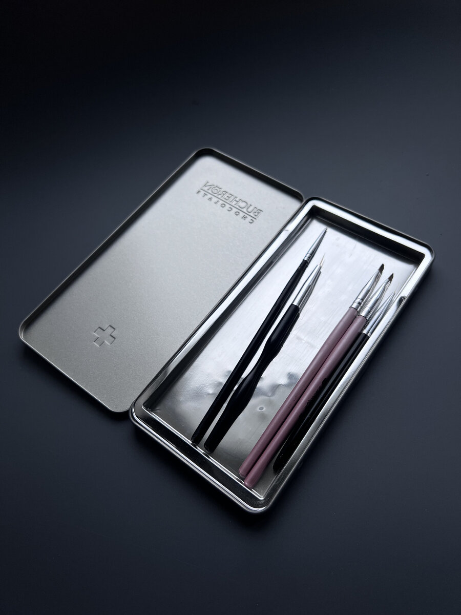 На самом деле это премиум-шоколад в металлическом боксе, который прекрасно подходит для хранения кистей мастера ногтевого сервиса.