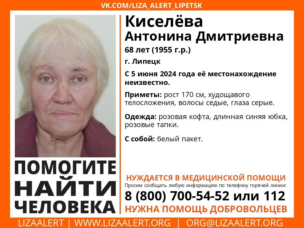 В Липецке начались поиски пропавшей 68-летней Антонины Дмитриевны Киселевой. В минувшую среду, 5 июня, женщина вышла и дома и не вернулась. Об этом сообщили в региональном отделении поисково-спасательного отряда «Лиза Алерт». — Нуждается в медицинской помощи, — добавили волонтеры. Приметы пропавшей пенсионерки: рост 170 сантиметров, телосложение худощавое, седые волосы и глаза серого цвета. В день исчезновения Антонина Киселева была одета в розовую кофту, длинную юбку синего цвета и розовые тапки. С собой у бабушки был белый пакет. Если вы что-то знаете о возможном местонахождении пожилой липчанке, то сообщите об этом по телефонам — 112 или 8 (800) 700-54-52.