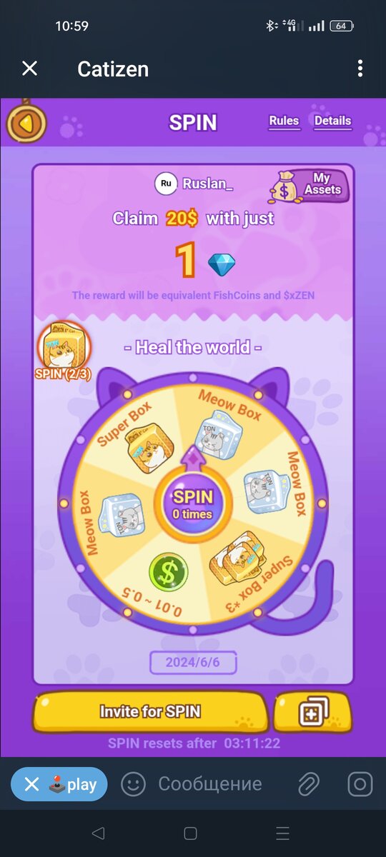 В игре Catizen в телеграм добавили новую активность в виде рулетки (кнопка SPIN на главном экране). Ссылка для перехода https://t.me/catizenbot/gameapp?startapp=r_1020_2361837 Крутим колесо указанное в центре количество раз. Нам необходимо потратить все синие кристаллы. После окончание попыток дополнительно вращать колесо можно только после приглашения друзей по ссылке. Дроп 20$ в игровой валюте (FISH), которые можно потратить в автокликер или ждать стейкинга. Предлагаю взаимопомощь по выполнению, в комментариях можно оставить ваши ссылки после перехода по моей. Я перейду по вашей.