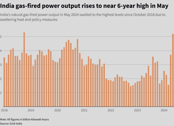 Доля угля в энергогенерации снизилась в мае, а доля газа почти удвоилась. Изнуряющая жара и политические меры способствуют резкому росту использования произведенной на газе энергии в Индии, при этом импорт сжиженного природного газа (СПГ) по прогнозам резко вырастет в ближайшие два года, пишет Reuters со ссылкой на экспертов и источники в отрасли. По данным Grid India, выработка электроэнергии на газе в стране удвоилась в апреле и мае до 8,9 миллиарда киловатт-часов (кВтч) по сравнению с тем же периодом прошлого года, впервые с момента принятия закона о сжигании угля. Потребление газа в мае оказалось рекордным с октября 2018 года. В 2023 году более 75% выработки электроэнергии в Индии приходилось на уголь, тогда как в последние годы на долю газовых электростанций приходилось лишь около 2%, в основном из-за высокой стоимости газа по сравнению с углем. В мае доля угля упала до 74% по сравнению с 75,2% за тот же месяц прошлого года, тогда как доля газа почти удвоилась до 3,1% с 1,6%. По с