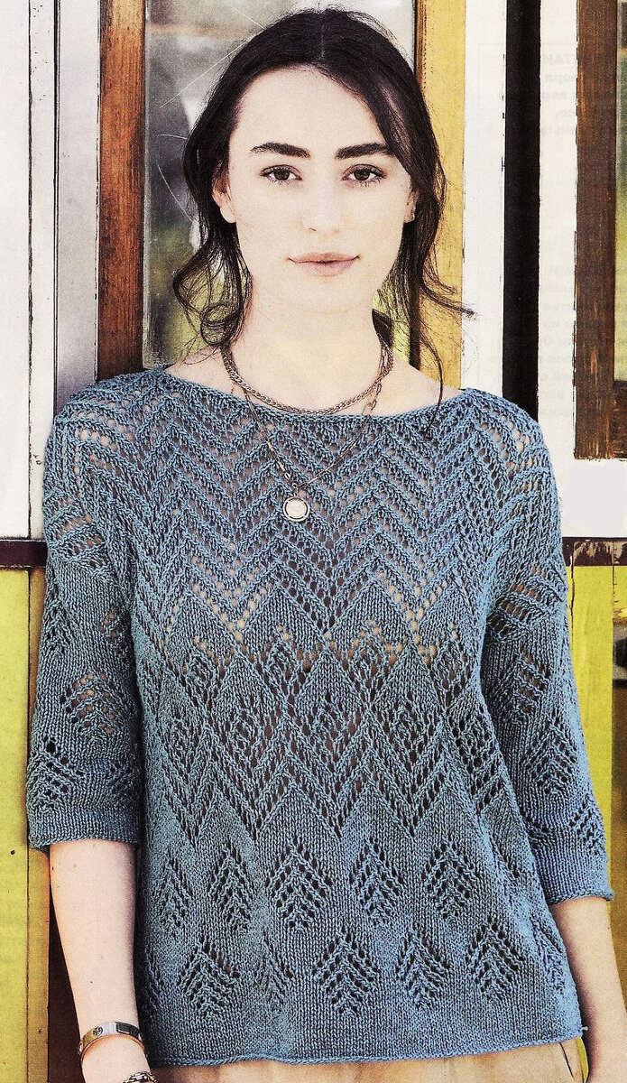 Гармоничное сочетание ажурного волнистого узора и полосок, занимающих верхнюю часть пуловера и рукавов, подчеркивают женственные изгибы фигуры и завораживают взгляд.