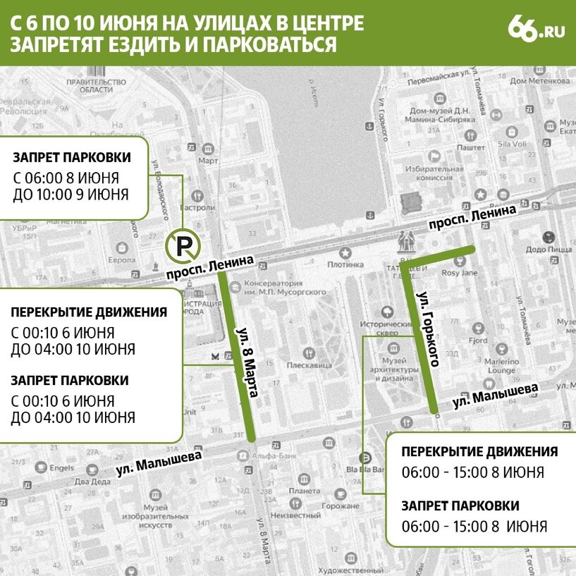 - улице 8 Марта от проспекта Ленина до улицы Малышева (с 00:10 6 июня до 04:00 10 июня);