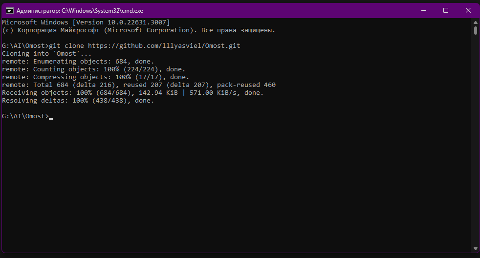Затем нам нужно повторить команду cmd, но уже находясь внутри только что созданной папки Omost.