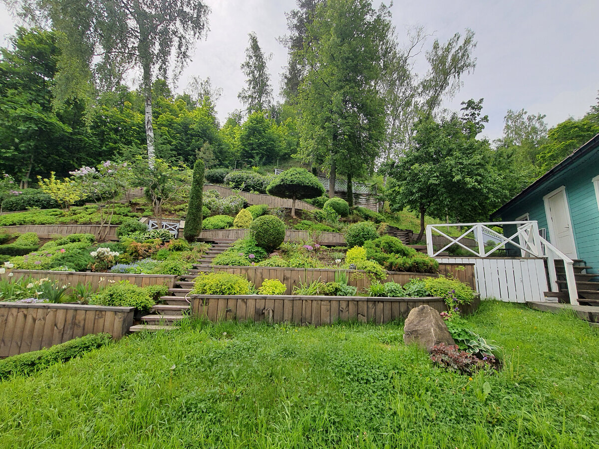 Гуляя по Плёсу,обнаружила прекрасный сад, хозяева которого любезно разрешили пофотографировать его. Сад представляет собой узкие террасы, карабкающиеся вверх по склону и оформленные очень живописно. Центральное украшение сада -- несомненно вот эта ель,подстриженная в виде шляпки от гриба. Как вы видите,в саду довольно много и других растений со сформированными кронами. Подпорные стены оформлены по разному: крупными камнями,стелющимися кустарниками или просто газоном. Уюта и тепла добавляют дорожки из досок. Есть и несколько мест для отдыха. Например вот это -- с уютной скамейкой и возможностью смотреть на Волгу. Иногда создаётся ощущение,что этот сад бесконечен. А вот и главная доминанта сада. Сад на самом деле небольшой, но довольно большое количество террас, делают сад обширным и полным уютных уголков. Верхняя терраса сада оборудована,как место для сидения в саду. Вид оттуда замечательный! Нашлось место и для солярия. Вид из сада на Волгу. Иногда этот сад напоминает парк. С этажа н