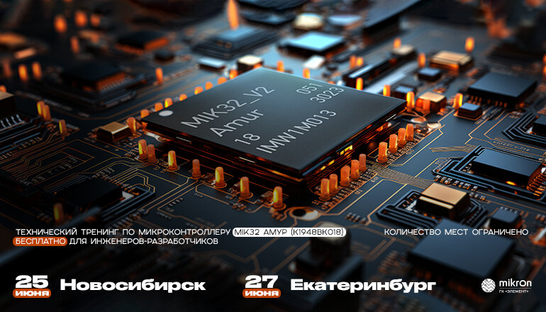 Тренинг включает лабораторные занятия и практику работы с отладочными платами, функциональными возможностями микроконтроллера и программно-аппаратных средств. Микрон, крупнейший российский производитель микроэлектроники (входит в группу компаний «Элемент», ELMT), резидент ОЭЗ «Технополис Москва», приглашает инженеров-разработчиков, программистов и всех заинтересованных в применении микроконтроллера MIK32 Амур производства Микрона в своих устройствах на однодневный технический тренинг в Новосибирске и Екатеринбурге. Участие в тренинге для инженеров-разработчиков бесплатное, по предварительной регистрации, количество мест ограничено. Зарегистрироваться можно здесь RISC-V 32-разрядный микроконтроллер MIK32 Амур (К1949ВК018) предназначен для устройств промышленной автоматизации и интернета вещей, беспроводной периферии, интеллектуальных сетей, охранных систем, сигнализации, телеметрии, мониторинга, умного дома и управления климатом, освещением и других потребительских и промышленных решени