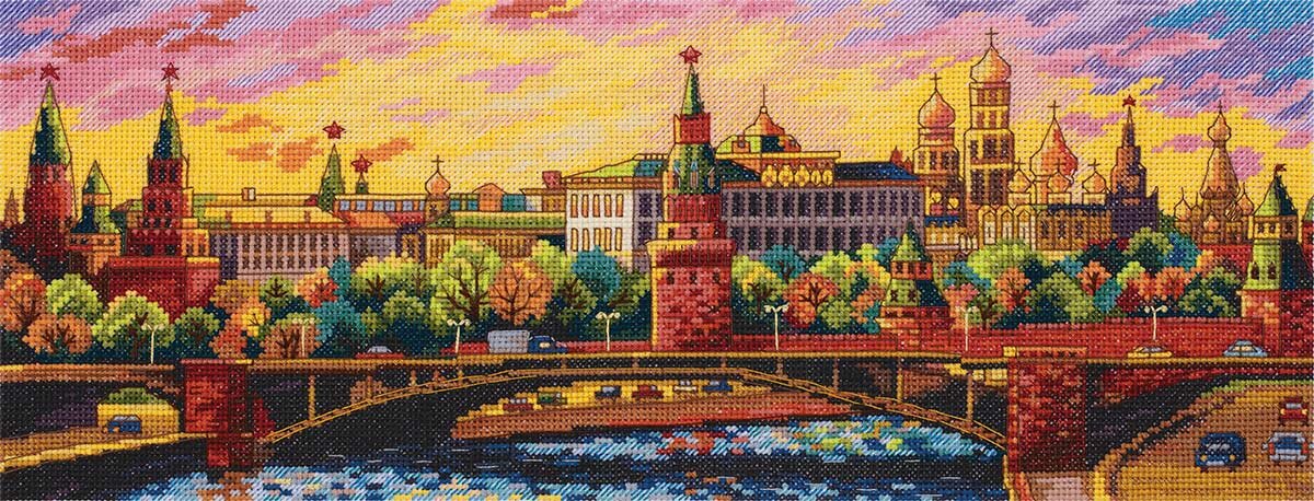 Когда мы думаем о Москве, то сразу вспоминаем Кремль. Вместе с PANNA вы можете вышить знаменитый панорамный вид. Кстати он открывается с Патриаршего моста, где часто можно встретить студентов художественного училища на пленэре. А вы сможете сразу вышить настоящую картину, где пойман момент заката. Передать мулине живописную красоту неба, эти огненные краски, архитектуру. Если посмотреть на готовую вышивку издали, то будет казаться, что Кремль написан красками!