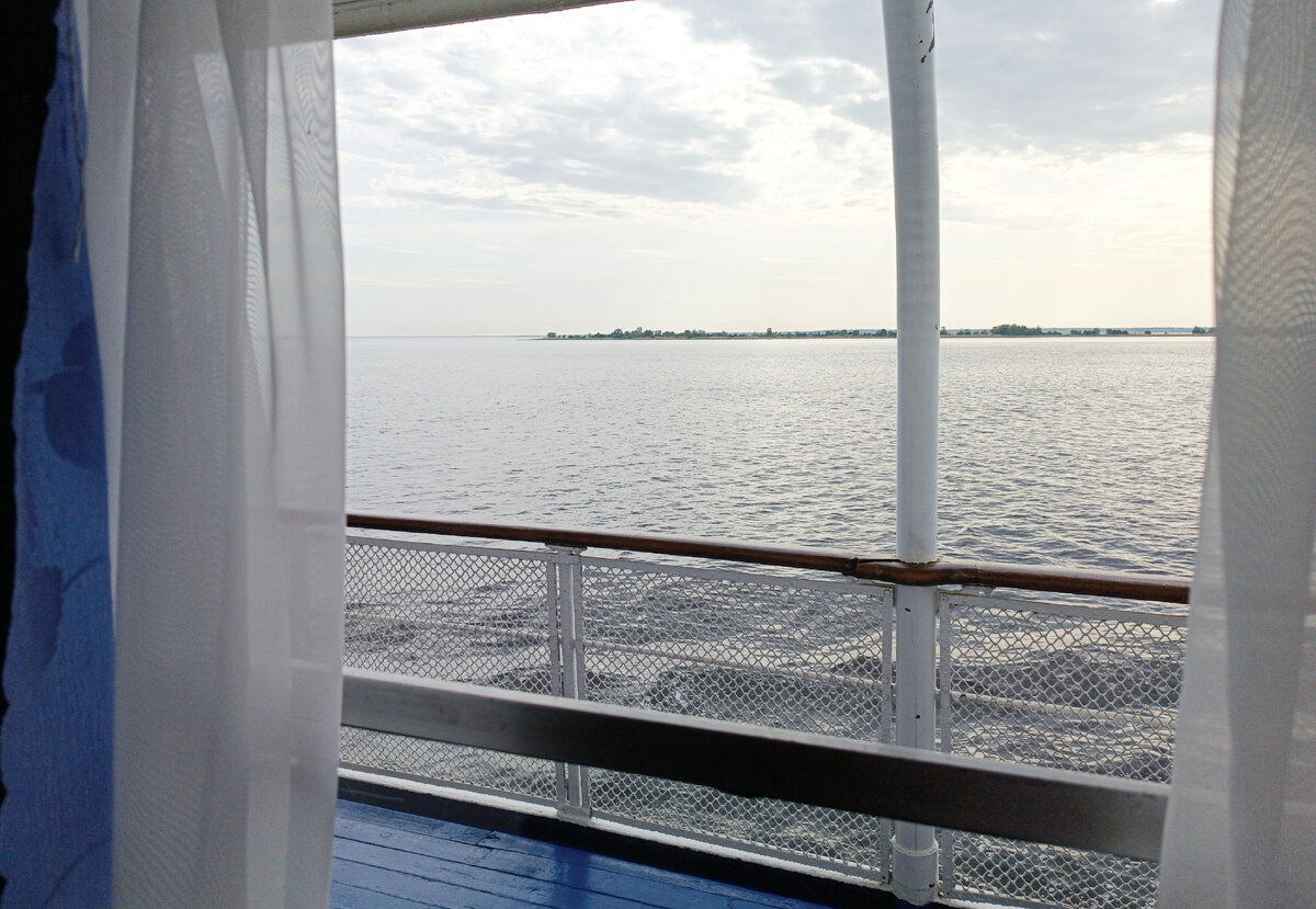 Всем доброго дня, дорогие друзья! А наше утро началось с вот такого вида за окном! Теплоход плавно движется в свой первый пункт назначения - порт Саратова. До него ещё целых три часа, за которые нужно успеть много - проснуться, сходить на зарядку, привести себя в порядок (без причёски и макияжа ведь никуда!), позавтракать и вовремя влиться в экскурсионную группу. Поэтому я, как умная женщина, решила зарядку пропустить, чтобы осталось побольше времени для сборов. Каждое утро в определённое время в каютах включается радио и тем самым открывает новый день для туристов интересной радиопрограммой, рассказами о местах, проплывающих за бортом, и, конечно же, хорошей музыкальной подборкой. Но в это утро радио почему-то молчало... Уже и 7-30 на часах, время пробуждения, а из динамика тишина... Наверное, барахлит, так я решила. Потихоньку продолжила наряжаться, потом уже и Дениску будить принялась - как раз час до завтрака оставался. Я порадовалась, какая я умная и всё правильно рассчитала