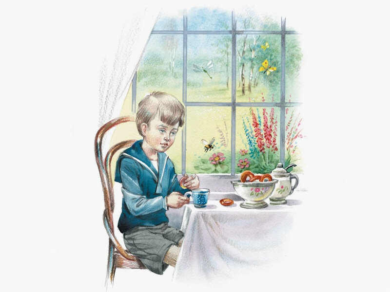Все вокруг маленького Коли наполнено счастьем: и завтрак на застекленной веранде, и то, как «за окнами на ярком солнышке мельтешат своими серебристыми листочками березы… порхают бабочки, жужжат суетливые мухи разных пород и калибров, плавно проносятся деловитые пчелы... и глазастые голубые стрекозы с трепетными прозрачными крылышками, и мохнатые добродушные шмели, и злые полосатые осы», и клумба с цветами перед домом: «вот пахучие, пылающие, как огоньки, настурции. Словно озорные мальчишки, они карабкаются по толстым, кривым, узловатым стеблям, прячутся под большими круглыми листьями, похожими на зеленые зонтики. Вот маргаритки. Они как маленькие примерные девочки: чистенькие, аккуратненькие, немного застенчивые, стоят на своих тонких ножках и, склонив набок головки, о чем-то секретничают между собой. А вот анютины глазки – гордые красавицы. Разодевшись в яркие нарядные платья, они словно собрались на бал… резеда: скромные, крошечные, неприметные цветочки с тонким, неповторимым, на всю жизнь запоминающимся запахом… Если встать ночью, когда все спят, то на клумбах можно увидеть гномиков, то есть маленьких человечков ростом с палец».
