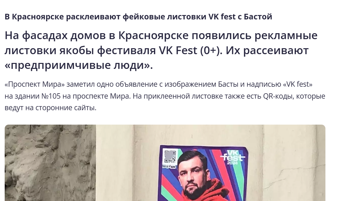 В Красноярске появились сомнительные листовки, анонсирующие VK Fest с рэпером Василием Вакуленко, более известным как Баста. «Предприимчивые люди», воспользовавшись тем, что артист действительно будет выступать в городе, расклеили афиши с фейковыми QR-кодами, которые ведут на сторонние ресурсы. Подобные афиши — попытка обмана красноярцев. Злоумышленники пытаются заработать на доверчивых гражданах и расклеивают эти листовки в Центральном и Советском районах города. Организаторы фестиваля сообщили, что афиши являются ложными. «Мы видим, что некоторые предприимчивые люди, пользуясь известностью нашего фестиваля, пытаются продвигать за наш счет свои услуги. Убедительно просим жителей Красноярска проверять информацию и пользоваться только официальными ресурсами VK Fest: сайт vkfest. ru и официальные сообщества фестиваля. Их легко идентифицировать по „синей“ галочке ВКонтакте», — подчеркнул PR-менеджер мероприятия. Ранее Баста в своих соцсетях анонсировал выступление на фестивале в Красноярс