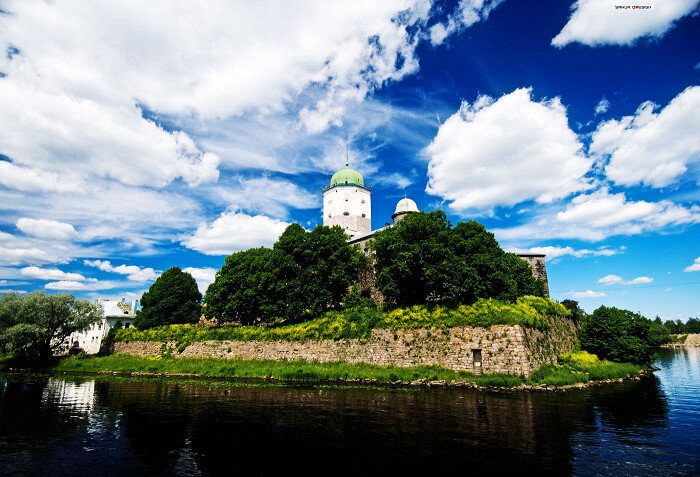 Лучший вид на Выборгский замок открывается с Петровской набережной: крепостной вал, заросший зеленью, наружная оборонительная стена полукружьем и величественная 50-метровая башня Святого Олафа в центре.