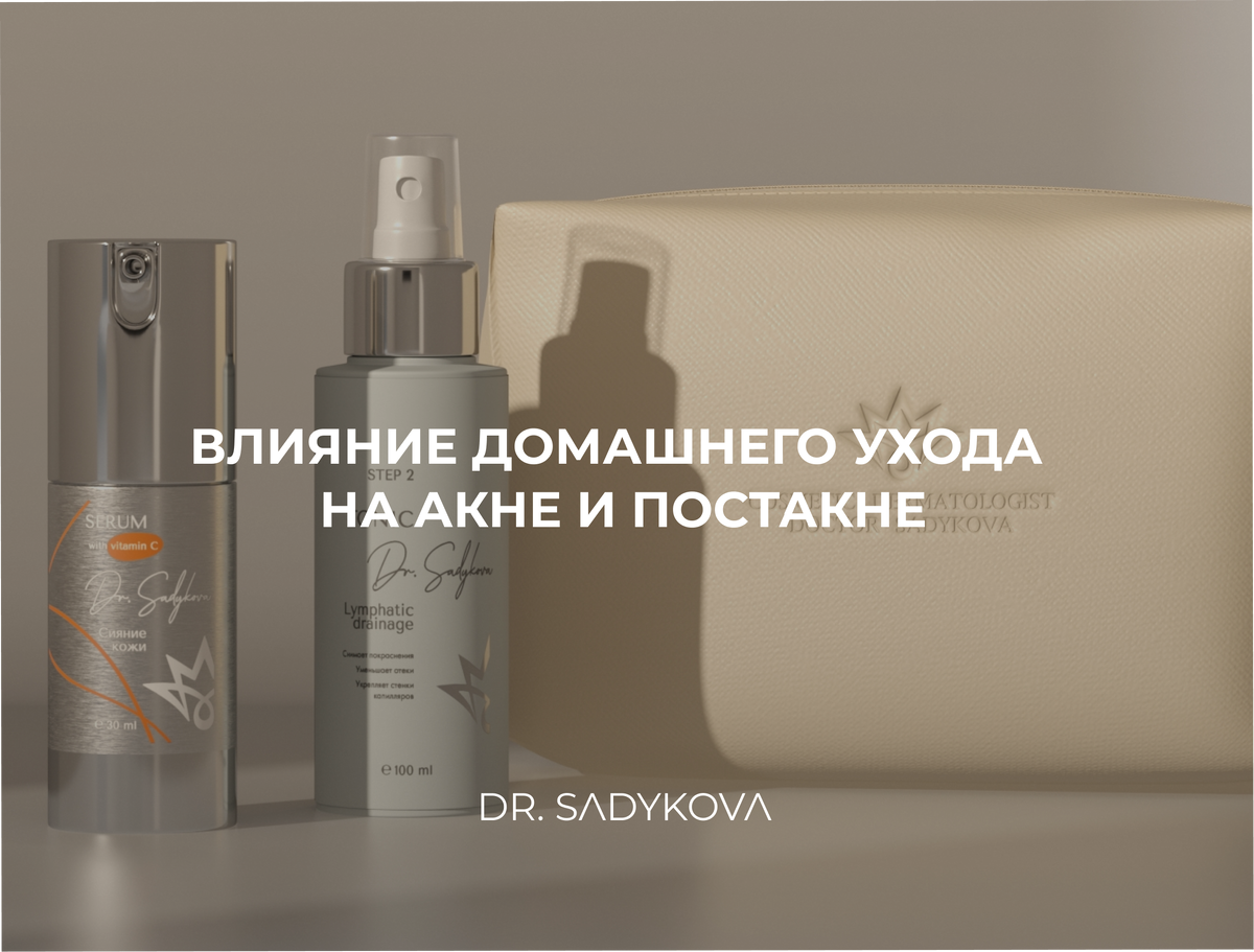 Мы выявили причины появления акне, развеяли мифы и узнали, какие продукты противопоказаны и какие показаны при болезни акне. Сегодня я бы хотела подробнее рассказать о влиянии домашнего ухода на акне и постакне. Несомненно, косметологические процедуры по лечению данной болезни показаны и проводятся у нас в клиниках. А так как лечение довольно длительное, то важно поддерживать свою кожу правильно подобранным уходом. А мне не поможет просто кремушек на ночь? НЕТ. И я сейчас говорю о протоколах ведения пациентов с акне от бренда Dr. Sadykova. Комедональная форма акне (комедоны и папулопустулы до 5 шт.): 1) Мягкий очищающий гель, уменьшающий жирный блеск и сужающий поры Sebo Clear. 2) Утром — тоник Hydro mist + крем с SPF-6, вечером — тоник Skin tone. 3) Клензит гель 1% наносить 1 раз в 3 дня вечером. 4) В остальные дни вечером — интенсивно восстанавливающий крем. Протокол ухода при папулопустулезной форме: 1) Умывание гелем Gentle cleanse 2-3 раза в неделю в течение 1-2 мес, затем 1 раз в