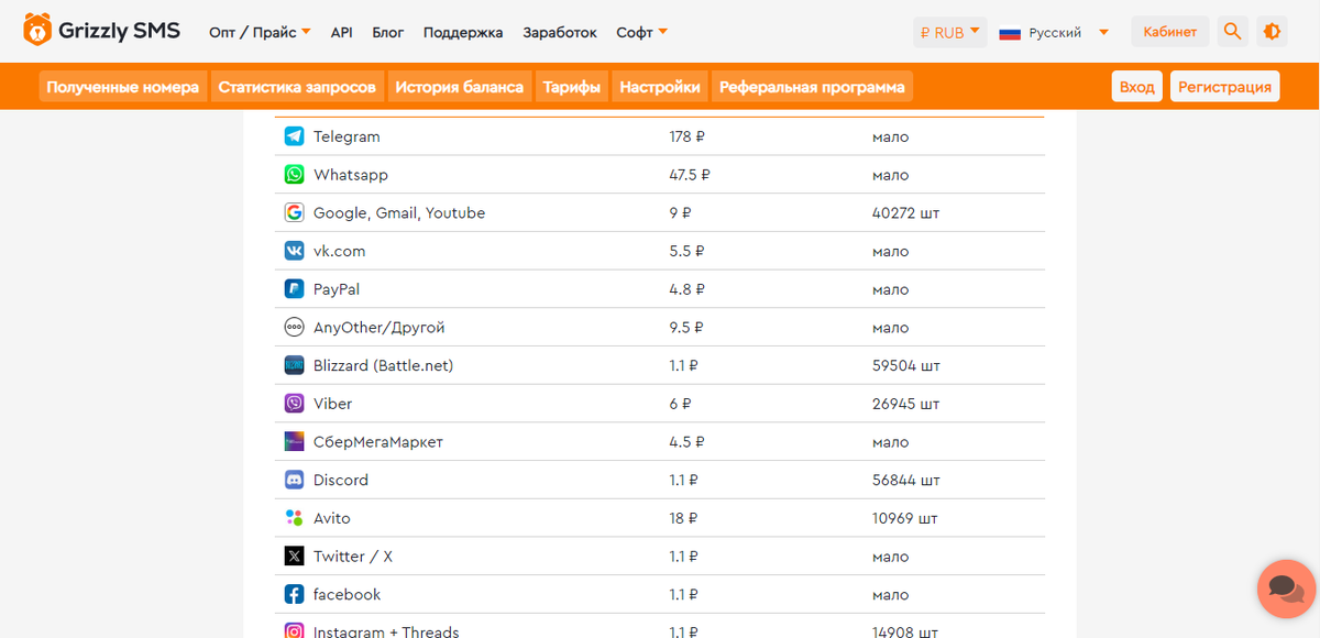 Цена за SMS зависит от страны и сервиса. Например, активация с российского номера ВК стоит 50 руб., ТГ – 245 руб., Авито – 28,67 руб., Discord – 11 руб., Одноклассники – 15 руб. и т.д.