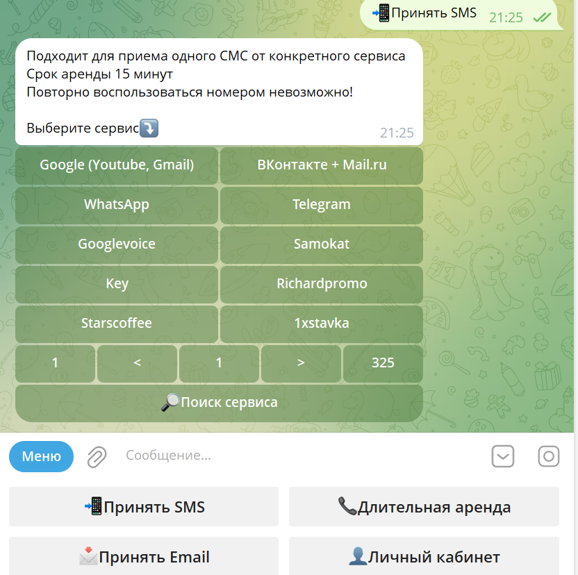 - Аренда номера. Срок – от 1 дня до 1 месяца (с возможностью продления). Позволяет принимать сообщения в неограниченном количестве для какой-либо площадки в течение всего срока аренды