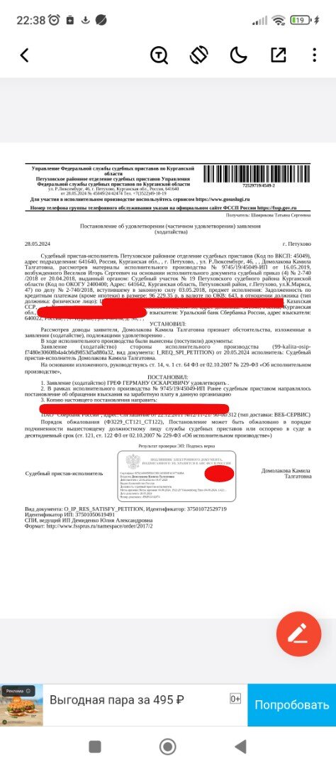 Всё, это конец, дальше нет сил просто. Зашла на госуслуги, а меня там ждало вот такое письмо счастье. Как я рассказывала ранее, 31.05 я внесла последний платёж, и оставалось мне заплатить 6200 сбор. А сейчас вот это... Согласно этому ходатайству я должна заплатить ещё 23880 рублей.