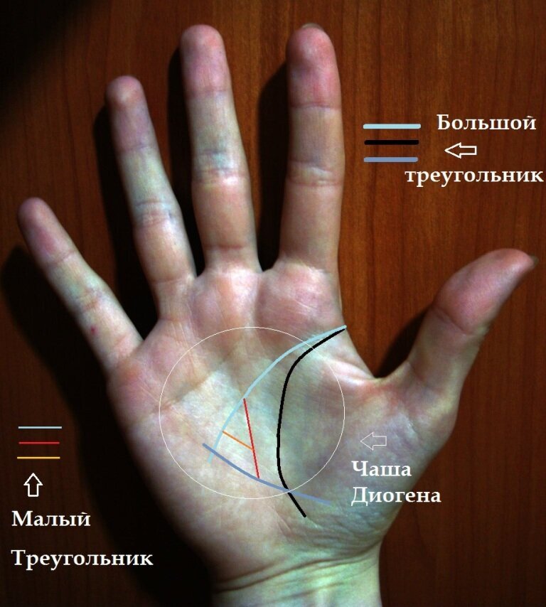 Поскольку большой треугольник охватывает чакру ладони, он напоминает статуи с геометрическими фигурами в середине ладони, распространенные в индуизме и буддизме. Итак, мы еще раз поработаем с энергией чакры руки — ведь она так могуча. Подготовьтесь к работе с энергией наиболее подходящим для вас образом. Когда откроете чакры ладоней, указательным пальцем второй руки начните вычерчивать треугольник вокруг середины ладони рабочей руки. Если большой треугольник четко очерчен, обводите его по линиям ладони. В противном случае просто рисуйте воображаемый треугольник. Пока будете медленно и многократно очерчивать треугольник, представьте поток энергии главных и второстепенных линий. Отмечайте все, что придет в голову, когда станете представлять каждую линию, и отследите каждую мысль о качествах линий — ведь они касаются вас. Не выносите никаких суждений ни о чем, что бы вы ни подумали. Думайте о том, как будете изменять те черты, которые вам не нравятся. Помните о том, что успеха невозможно