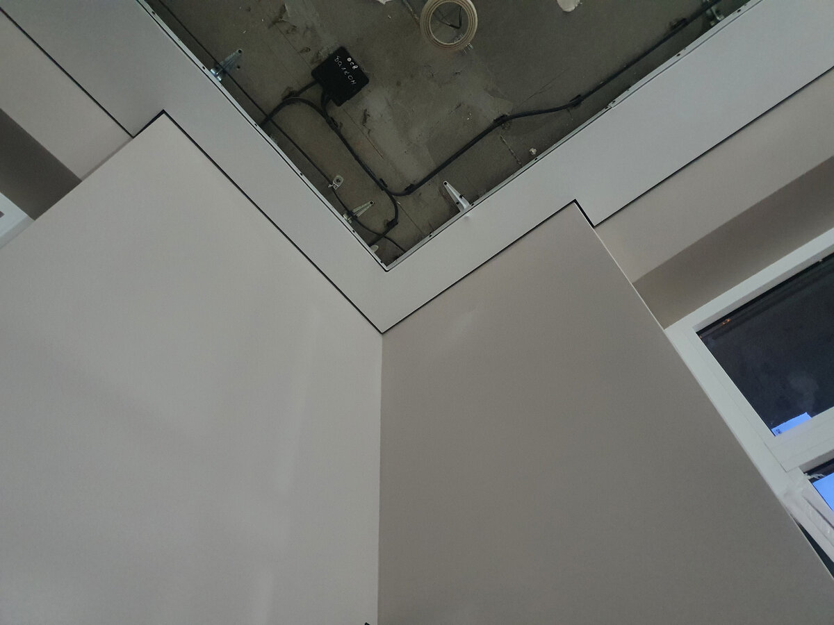 Теневой профиль визуально не соприкасается со стенами и имеет чёткую линию тени. Избавляет от использования маскировочной ленты. Зазор между потолком и стеной имеет толщину 7мм.
