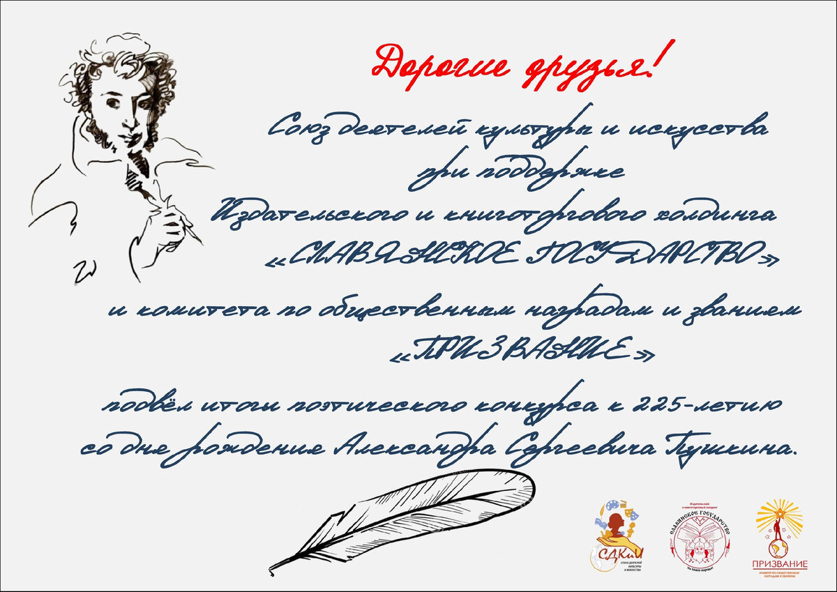 Сайт sdkii.ru Дорогие друзья! Союз деятелей культуры и искусства при поддержке Издательского и книготоргового холдинга «СЛАВЯНСКОЕ ГОСУДАРСТВО» и комитета по общественным наградам и званиям «ПРИЗВАНИЕ» подвёл итоги поэтического конкурса к 225-летию со дня рождения Александра Сергеевича Пушкина. Представляем победителя и призёров: Призёр (3 место) — Бокарева Юлия Геннадьевна за произведение «Что видел осенью Поэт?»; Призёр (2 место) — Джикирба Хаджарат Шотович за произведение «В зимнем поле ветер дует»; Победитель — Брагин Илья Борисович за произведение «Пророк». Победитель награждается именным дипломом, сертификатом на бесплатное издание электронной книги в Издательском и книготорговом холдинге «СЛАВЯНСКОЕ ГОСУДАРСТВО» и реализацию изданной книги в интернет-магазине «Книжный Атласъ» с авторским отчислением с продаж. Участники, занявшие второе и третье призовые места, награждаются именными дипломами и сертификатами со скидками 30% и 15% на издание авторских кн