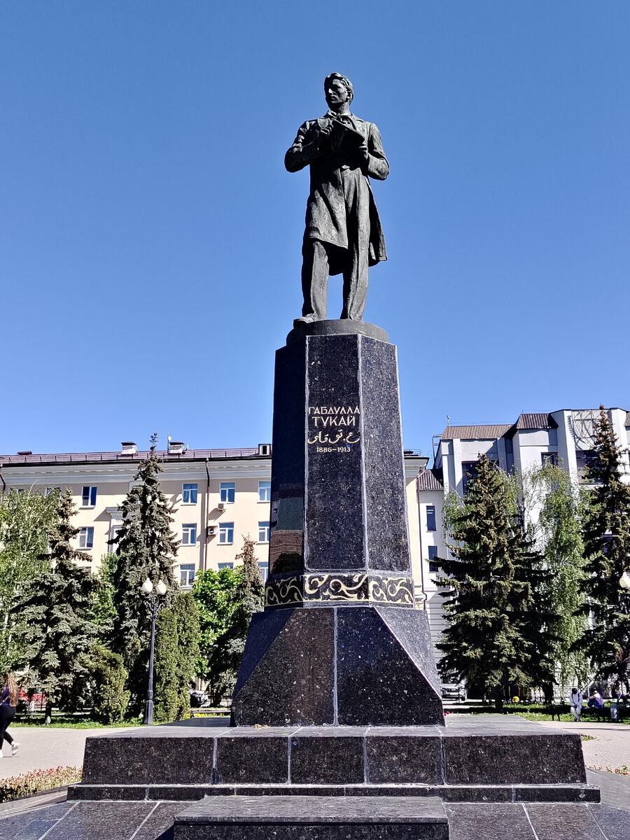 Продолжаю рассказывать, как я в свой последний день в Казани гуляла по Старо-Татарской слободе. После площади Юнусова я пошла по пересекающей ее улице Габдуллы Тукая – это татарский поэт, которого сравнивают с Пушкиным за его вклад в национальную культуру. Он тоже умер молодым, но оставил большое поэтическое наследие. Это памятник поэту неподалеку, на улице Татарстан. На этой улице тоже были симпатичные дома, но уже более современные, что не так интересно. Поэтому, дошагав до первого перекрестка, я вернулась на улицу Каюма Насыри (татарский ученый и литератор XIXвека) – и оказалась прямо у музея чая. Но мой лимит посещения музеев в Казани был уже исчерпан – я имею в виду не материальный, а лимит восприятия. Ну никак мне не хотелось больше в какой-либо музей. А в симпатичные ворота рядом мне очень захотелось войти. Во дворе оказалось так интересно. Мужчины такие видные стоят. Во дворе солидные каменные дома. Рядом то телега, то группа домашних животных. Цветочные экспозиции. Ес