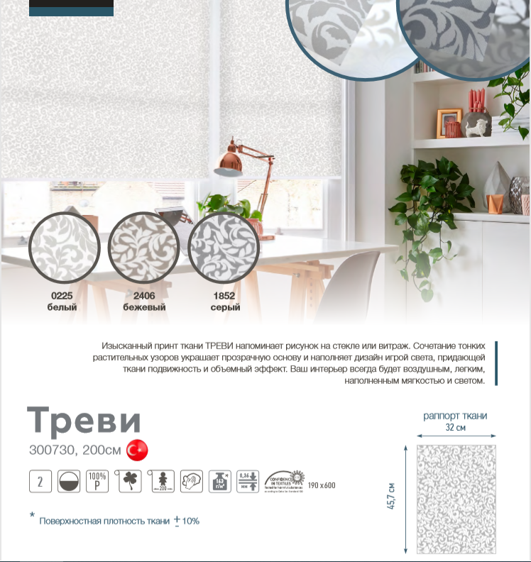 Изысканный принт ткани ТРЕВИ напоминает рисунок на стекле или витраж. Сочетание тонких растительных узоров украшает прозрачную основу и наполняет дизайн игрой света, придающей ткани подвижность и объемный эффект. Ваш интерьер всегда будет воздушным, легким, наполненным мягкостью и светом.