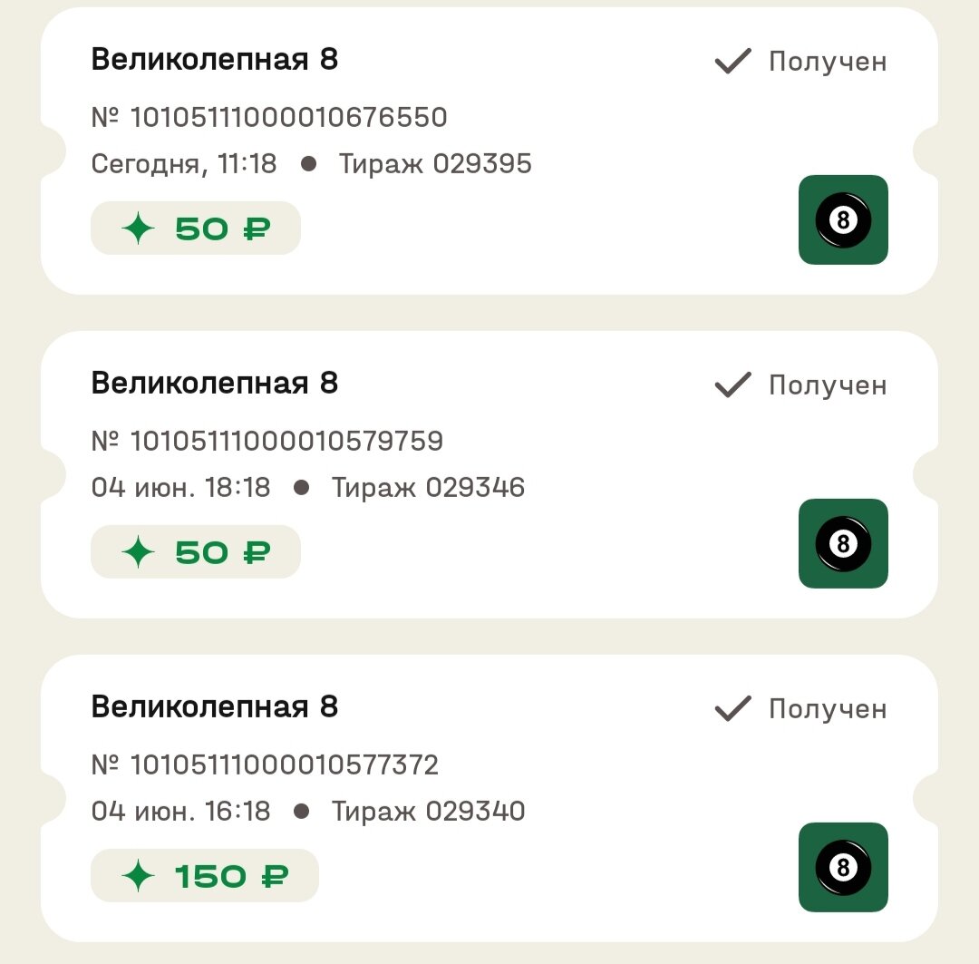 Приветствую всех!!! Среди недели решил поиграть в ежедневные лотереи от Столото и Национальной лотереи. 4-5 июня была 50% скидка на "Великолепную 8", билет стоял по 40 рублей, вот что удалось выиграть. В пятой скорости тоже небольшой выигрыш был, стоимость билета 60 рублей. В Столото играл в Бинго, там минимальный приз в два раза больше. Ничего крупного или больше 200 рублей, даже не попалось в этот раз. В целом остался при своих, по выигрышным и проигрышным билетам. Вот как то так!!! Всем здоровья, удачи и крупных выигрышей!!! Подписывайтесь на канал, ставьте 👍 👍 👍.