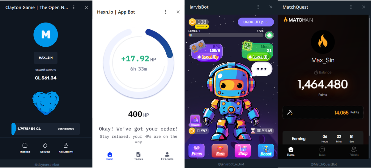 Вот 4 новаторских проекта, которые только начинают завоевывать свою аудиторию. Присоединившись к ним на ранней стадии, вы сможете извлечь максимальную пользу в долгосрочной перспективе. Эти проекты предлагают возможность пассивного майнинга, где ваша задача - просто регулярно собирать (нажимая “claim”) добытые монеты, не требуя при этом никаких инвестиций. * * * 1. Clayton Game - это уникальный проект в сети Telegram, представляющий собой игру, связанную с майнингом. Клейтон, дружелюбный синий маскот TON, создан из космической пыли и блокчейн-магии, чтобы вместе с пользователями погрузиться в мир криптовалют и блокчейна. Игра позволяет каждому зарабатывать $Clayton очки, собирая их каждые 6 часов и выполняя задания. Проект активно развивается, количество участников уже перевалило за 15000, и в ближайшем будущем планируется добавление новых функций и механик. Ссылка: Играть_Clayton_Game 2. Jarvis Bot - это инновационная платформа, которая использует искусственный интеллект для создани