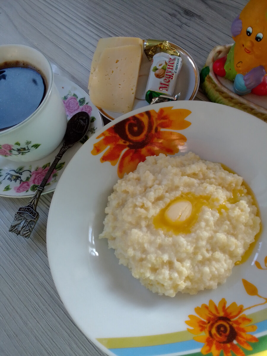 Доброе утро всем моим подписчикам и гостям моего канала! С вами Надежда, и я приглашаю вас на мою кухню, где покажу вам наше меню на день. Вчера вечером у нас прошел небольшой дождь, природа сразу же оживилась, словно умылась чистой дождевой водой. Утро замечательное . 5 часов утра, а температура уже около 20 градусов. Опять обещают ливни. Надо, надо дождей. Все, у кого есть сады и огороды, ждут их. Сегодня я выхожу из дома в 7:00, так что времени у меня предостаточно. Буду готовить полноценный завтрак. На завтрак молочная пшенная каша с сахаром и сливочным маслом, растворимый черный кофе без сахара, с конфетой Медунок и два тоненьких пластика сыра. Пшенную кашу я люблю, которую я начинаю варить еще с вечера, а утром наливаю сразу же молоко, добавляю сахар и довариваю, варится она минут 10 на слабом огне на рассекателе. Рабочий день у меня короткий, обедать буду дома. В 13:00 я уже на остановке, жду свой автобус, на улице жара, на термометре показывает 31 градус. Остановка находитс