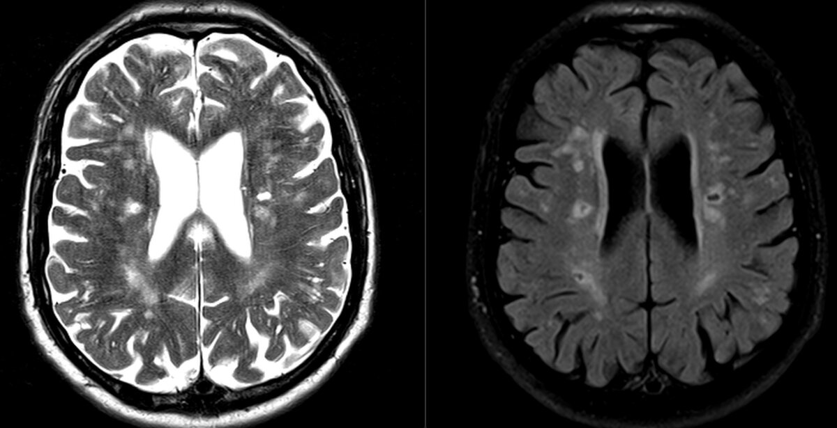 На МРТ мозга видим печальную картину: уменьшение объёма мозга (атрофия), множественные очаговые изменения, в т.ч. есть много "дырок", как в сыре: