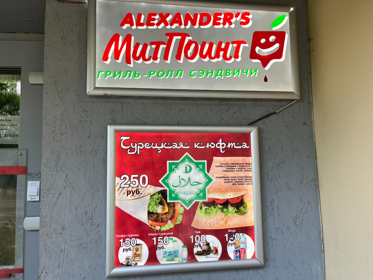 Стритфуд дня – турецкая кюфта за 250 рублей в МитПоинт по адресу Вознесенский переулок, 14. Это в районе Тверской – между Пушкой, Арбатом и Манежной площадью. Заведение представляет собой окошечко, работающее 24/7. В меню одно блюдо – кюфта в лаваше. Покупатель может повлиять только на вкус, сообщив шаурмейстеру (зачёркнуто) кюфтоделу уровень остроты. Ну и некоторое разнообразие напитков: турецкий кофе, чай, магазинный айран, газировка. Рейтинг на Яндекс картах 4.6 на основании более чем 1.3k оценок. Пишут, что качество скатилось в последнее время, раньше было лучше. Другим норм, называют лучшим фастфудом в округе. Что ж, надо пробовать. Свиток на выдаче кажется совсем небольшим, но по факту турецкая кюфта довольно сытная. В лаваш завёрнуты пряные котлетки из говядины с бараниной (вкус самый что ни на есть турецкий), помидор, сыр. Заявлен салат, но на мне, кажется, сэкономили – я его не обнаружил. Для удобства едока еду укладывают в герметичный конверт. Съедобно. Большого разочаровани