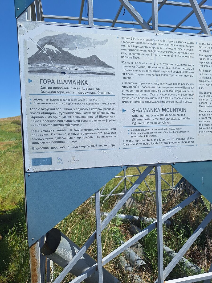 Все же время течет вперед, и у нас настал обеденный перерыв в наших практиках. Ну что обед был очень даже. Куриный супчик с лапшой, гречка с грибами. Все очень по домашнему. После обеда главная точка нашего пути. Главной достопримечательностью Аркаима является Лысая гора (Шаманка, Шаманиха)- остаток некогда грозного палеовулкана, который действовал на этом месте более 300 миллионов лет назад. Вулканы находятся на разломах земной коры, являясь аномальными зонами планеты. Видимо в этом секрет Аркаима? На древнешумерском языке «Ша» — Солнце, «Ман»- человек, то есть –человек Солнца. Эта гора на Аркаиме имеет первостепенное значение, вокруг нее самое большое количество легенд, поверий и тайн. По-другому Шаманку зовут горой исполнения Желаний и очищения от негативных энергий. На вершине этой горы находится рукотворная спираль - «Спираль Жизни». Но перед Шаманкой мы подошли к уступу Пегаса. Это такой камень, похожий на стол. Встали вкруг, на колени и прижались к камню (просто рыцари круглого