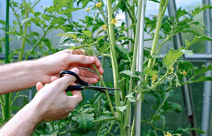 В июне томаты начинают быстро пускать новые пасынки, поэтому нужно вовремя их удалить. На этом этапе нужно подумать и определиться, на скольких побегах мы будем выращивать помидоры. Главная цель отщипывания боковых побегов и пасынков у томатов заключается в том, чтобы ограничить развитие зелёной массы (листьев, побегов) в пользу плодоношения. Растения, у которых убирают пасынки, плоды более крупные. А ещё, чем меньше лишней зелени, тем быстрее и равномернее созревают томаты. Высокорослые сорта можно оставлять на одном, двух, реже трех побегах. Удаление одного побега предполагает удаление всех последующих, которые будут пробовать вырасти из уголков на этом же самом месте, где отщипнули первый раз побег. Мелкие побеги лучше всего прищипывать пальцами. Если они станут большими, их лучше срезать ножницами или острым ножом. Особенно важно удалять боковые побеги, растущие чуть ниже соцветий, так как из-за их развития (забирают на себя питание) могут отмирать цветки и бутоны. При выращиван