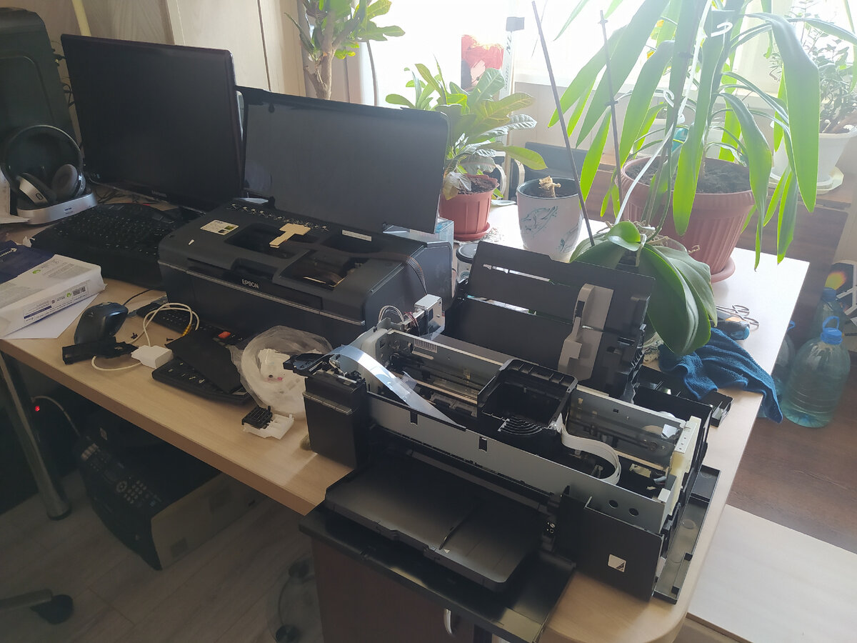 Мне доставили принтеры домой и Я приступил к работе. L800 запускался через раз, и весь ремонт закончился заменой электролитов в блоке питания. После этого принтер заработал исправно. В 110-й модели оборвался ремень каретки. Чтобы добраться до него, нужно разобрать половину принтера. А внутри всё в чернилах. Бр-р-р!