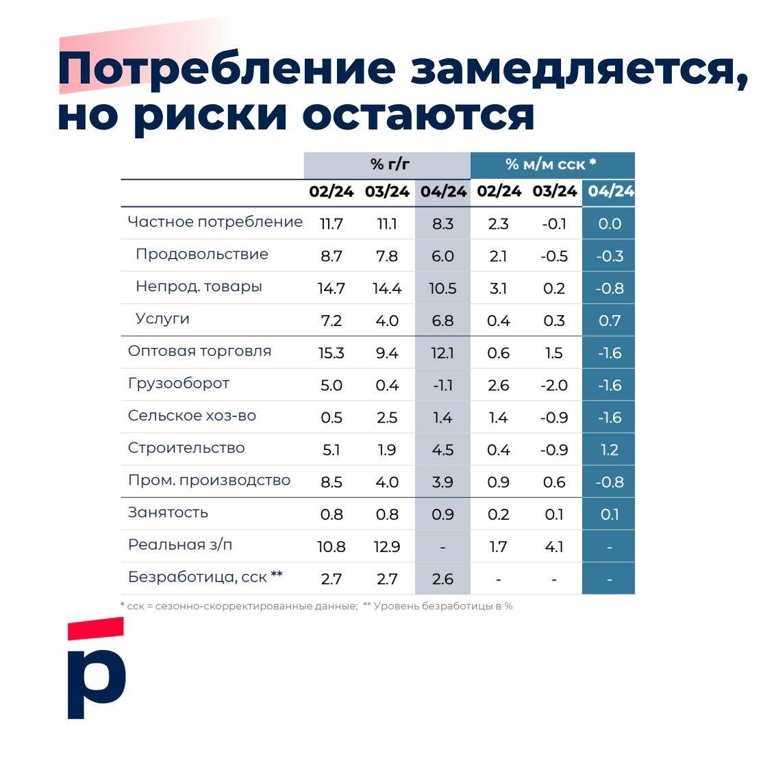 В апреле, по данным Росстата, продолжилась стагнация потребительского спроса, а также более отчетливо стали видны последствия решения ОПЕК+ в секторе добычи. В то же время рынок труда вновь удивил: в первую очередь, ростом заработных плат в годовом выражении. В преддверии интригующего заседания Банка России (7 июня) апрельские данные (а по заработной плате данные представлены лишь за март) стоит оценивать весьма аккуратно. В них нет однозначного «призыва» к повышению ставки, но остались предпосылки для «удержания ставки на уровне» (то есть сохранения жесткого сигнала) минимум до конца третьего квартала 2024 года. Потребление домохозяйств в товарных группах сохранило признаки поступательного замедления (-0.3% м/м сск в продах и -0.8% м/м сск в непродах). Тем не менее, сфера услуг осталась наиболее перегретой (+0.7% м/м сск), что неоднократно подтверждалось данными по инфляции. Рынок труда удивил не столько снижением безработицы до 2.6%, сколько ускорением роста заработны