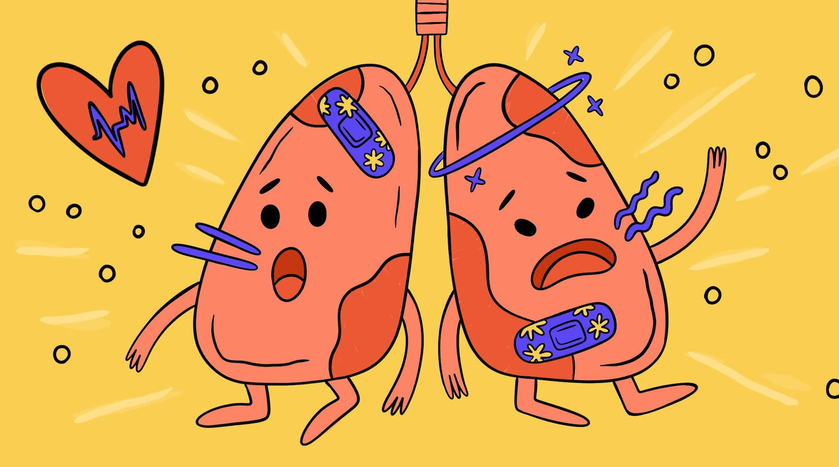 И если человек продолжает курить, альвеолы легких — пузырьки, в которых происходит обмен кислорода и углекислого газа — воспаляются и частично разрушаются. Так развивается эмфизема легких: острая нехватка кислорода и сильная одышка даже от легких физических нагрузок.