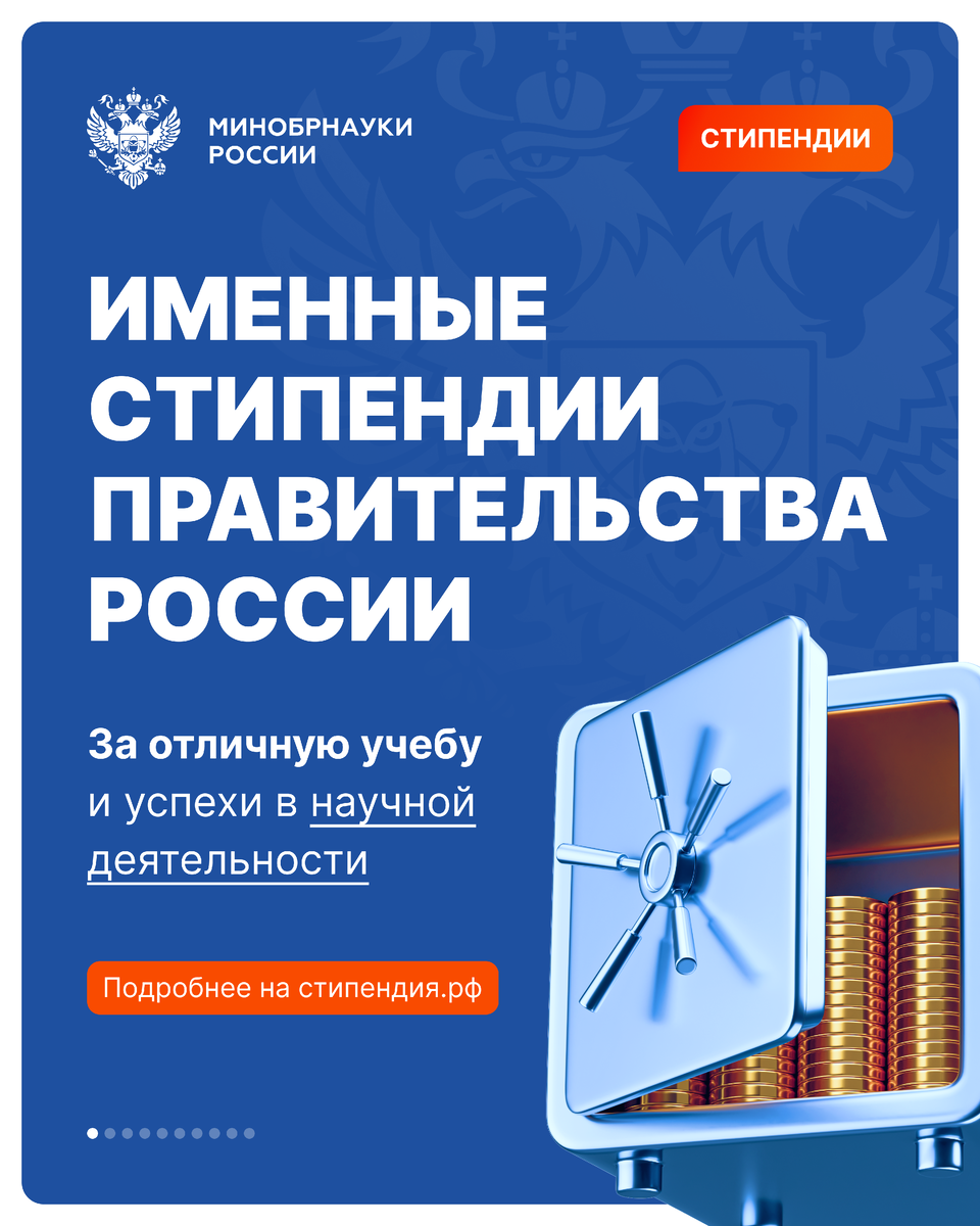 Талантливые студенты могут получить именные стипендии Правительства РФ. Какие именные стипендии существуют и какие требования предъявляются к кандидатам — смотрите в карточках. Конкурс на назначение данных стипендий будет объявлен во второй половине лета — следите за сообщениями на нашем канале и на сайте стипендия.рф