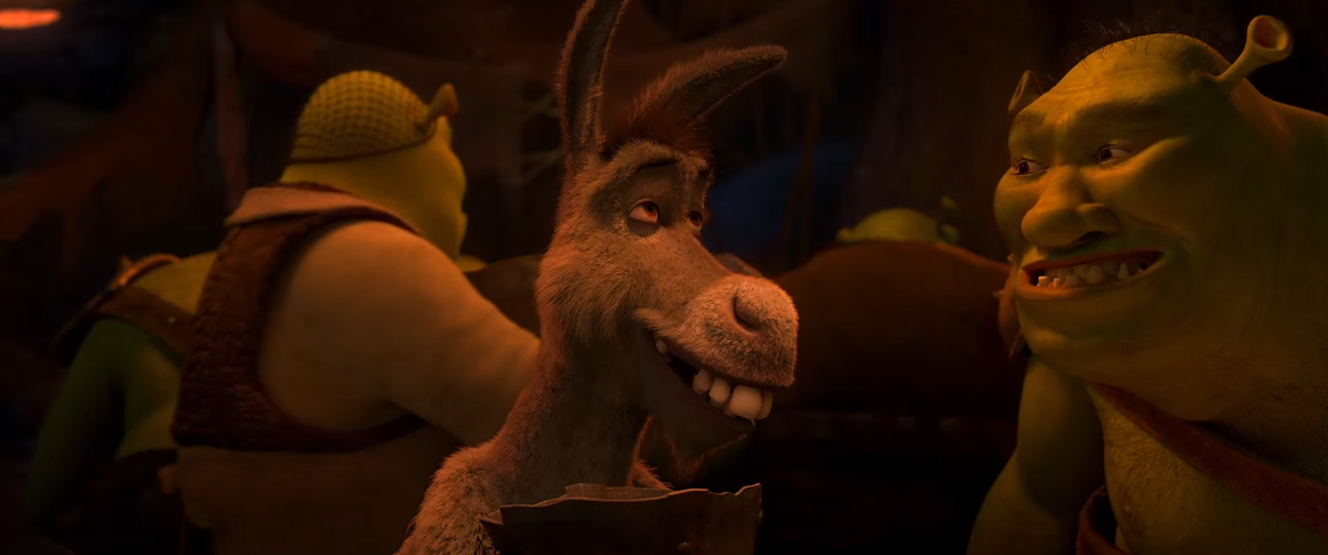 Когда ночью на болото Шрэка приходят все, кого Фаркуад сослал сюда, при первом взгляде, если присмотреться, то можно увидеть, что Осёл общается в первую очередь с Пиноккио, как будто он был с ним знаком когда-то и давно знает его. Да и скорее всего сам Пиноккио прекрасно понимает, что перед ним сейчас стоит тот самый старый и добрый Фитилёк, который превратился в того самого осла прямо у него на глазах.
