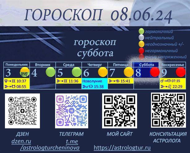 Гороскоп на субботу 08.06.24 Сегодня кульминация аспекта Венера квадрат Сатурн, но влияние этого аспекта мы будем ощущать еще и завтра. Этот аспект влияет на - отношения, аспект может создать проблемы в отношениях, и речь идет не только о партнере по браку/любимом, но и об отношениях с окружающими нас людьми - расхождения в каких-то принципиальных вопросах, обида, разлад, нежелание искать/идти на компромисс, упрямство, ограничение личного пространства, требования, ультиматум, охлаждение отношений, отдаление, отъезд, заблокировать контакт и т.д. Также такой аспект может говорить о том, что любовные отношения переходят в деловые, но не каждую из сторон это устраивает; - деловая сфера/работа – ссоры с руководством, мало предложений, продаж, лишение премии, заказа, отмена, задержка, препятствия, дополнительные условия, дополнительные обязанности без оплаты или с минимальной, не интересные предложения с финансовой точки зрения и т.п.; - финансы, ограничение финансов, потери, невыгодные сдел