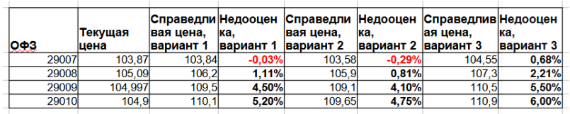 Справедливые цены для старосхемные ОФЗ ПК в этом случае следующие (выделены красным):