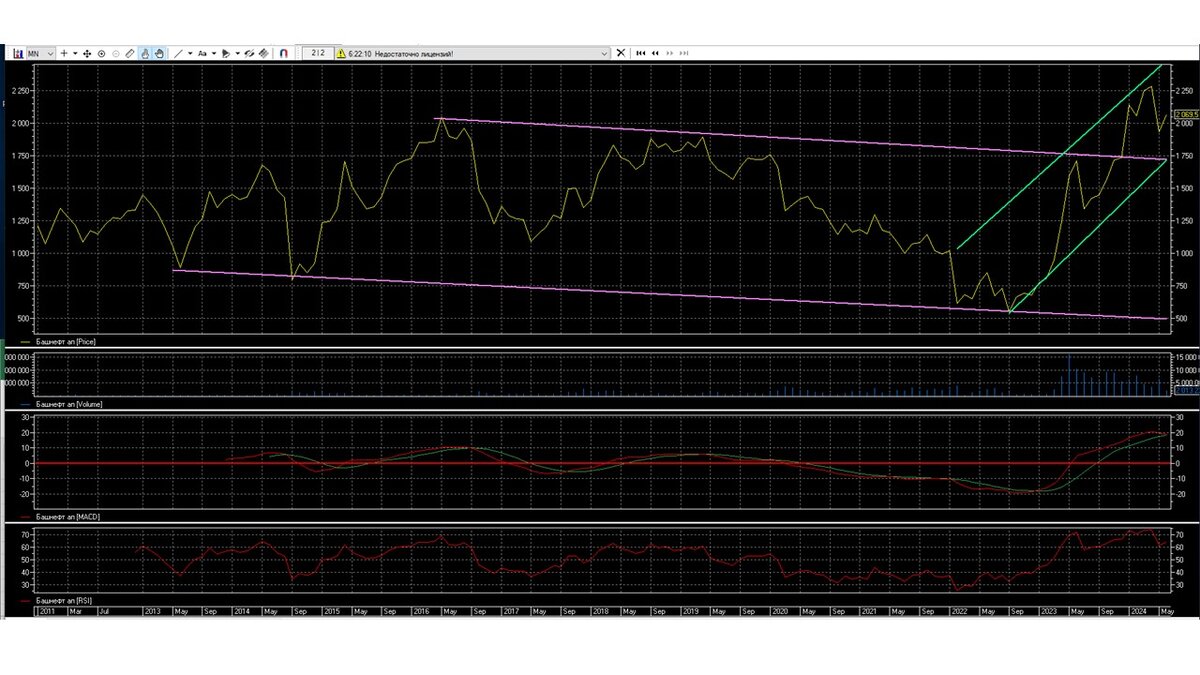 Дневной график показывает, что акция Башнефть (п) находится в растущем коридоре 1750-2500, где делает попытку вернуть потерянные рубежи.