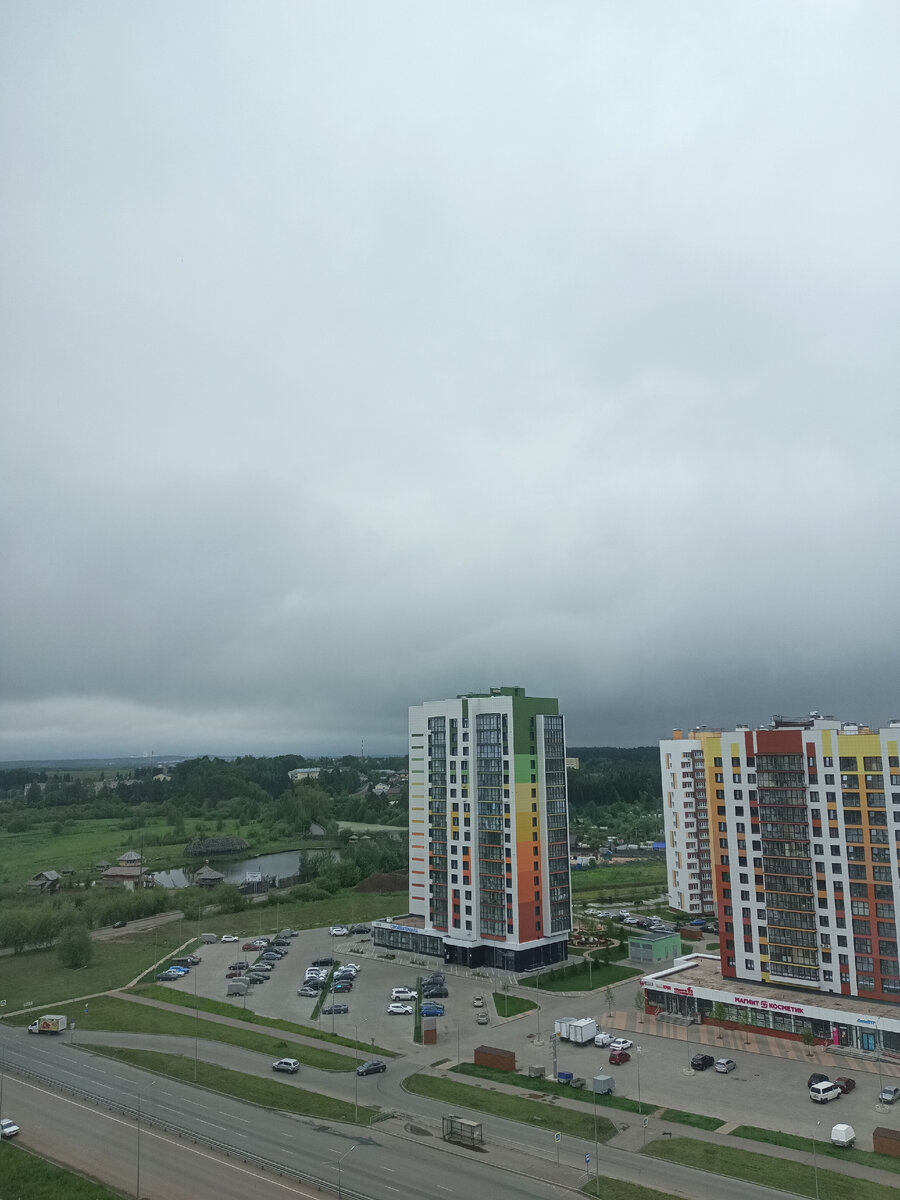 Всем привет. В течение недели в Кирове то дождь, то просто пасмурно, то выглядывает солнышко. Мне Киров нравится в любую погоду. Летом достаточно яркий город. Это платный пруд. Ловишь рыбу и у каждой рыбины своя цена. Вдалеке слобода "Зиновы". Теперь здесь новый микрорайон. Справа частные дома и дачи. Здесь говорят "сады". Небо затянуло не на шутку. Ливни тут явление частое. Вид с остановки. Другая часть города. Перекрёсток улиц Некрасова и Сурикова. Вот такой городок у нас.