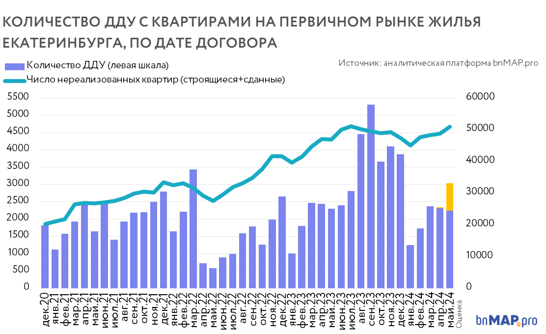 В мае-июне 2024 года на рынок новостроек пришло долгожданное оживление продаж. Активность покупателей растет на фоне приближения 1 июля, когда должна произойти отмена массовой программы льготного кредитования. Впрочем, текущие число ДДУ далеко от ажиотажного периода осени 2023 года, когда ежемесячно заключалось по 4-5 тысяч договоров. По данным аналитической платформы bnMAP.pro в мае 2024 года на рынке новостроек Екатеринбурга было зарегистрировано около 2,8 тысячи договоров долевого участия в строительстве. Число подписанных в мае договоров (которые уже прошли регистрацию) – около 2,3 тысяч штук. Это позволяет дать общую оценку количества сделок по ДДУ в прошедшем месяце - на уровне 3 тысяч. Хороший результат мая, и ожидания на июнь позволят продавцам создать неплохой задел для перехода к новому этапу развития рынка с адресными, но не массовыми ипотечными стимулами. Именно такие изменения декларируются правительством. Но проблема момента в том, что за несколько недель до 1 июля у уча
