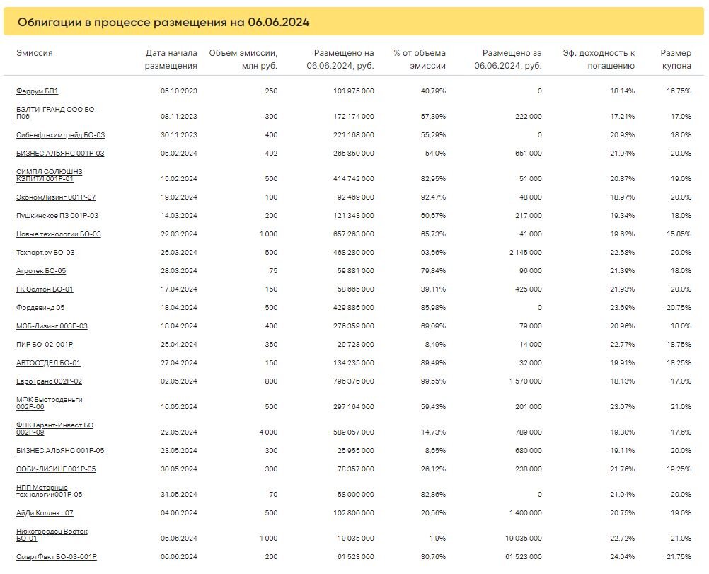 Коротко о торгах на первичном рынке 6 июня стартовало размещение двух выпусков: Нижегородец Восток-БО-01 и СмартФакт-БО-03-001P. Первый выпуск в первый день торгов был размещен на 19 млн рублей (1,9% от объема эмиссии) за 333 сделки, средняя заявка 57,2 тыс. рублей, второй — на 61,5 млн рублей (30,8%) за 395 сделок, средняя заявка 155,8 тыс. рублей. Коротко о торгах на вторичном рынке Суммарный объем торгов в основном режиме по 429 выпуску составил 709,6 млн рублей, средневзвешенная доходность — 17,35%. 📊 Подробнее в ВДОграфе Больше актуальных новостей читайте оперативно в нашем телеграм-канале
