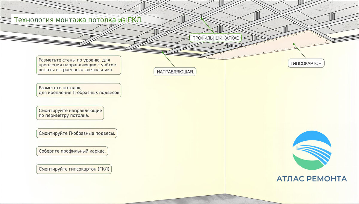 в первом пункте «Установка одноуровневого потолка из ГКЛ».