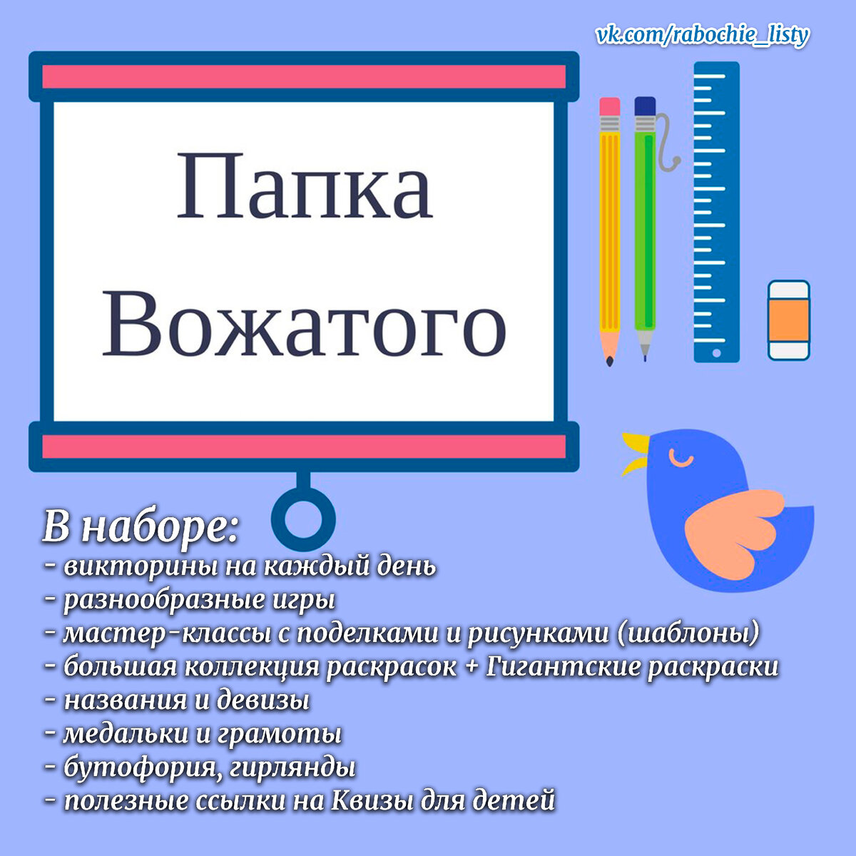 Отличная помощница для организации летнего досуга детей! ✅Что есть в папке? ✔комплекс игр и викторин для занятий в летнем лагере (40 видов) ✔ более 400 раскрасок (для девочек и мальчиков, антистресс, лето, семья, !гигантские раскраски!) ✔ грамоты, медальки, дипломы ✔ различные речевки, девизы, названия отрядов ✔ 37 различных поделок и рисунков с пошаговым выполнением и шаблонами (на каждый день) ✔ 10 интересных детских Квизов на разные темы (активные ссылки ко всем Квизам из Интернета) ✔бутофория и гирлянды для оформления ✔ игры бродилки, игры на знакомство, на сплочение, сценарии мероприятий «ТриУмф», "Пушкинский день", "Учебное пособие по организации детского досуга в лагере" и много другого материала собранного из свободных источников для вашего удобства! ✔ собрание разнообразных игр на площадке, в помещении и вне помещения Приобрести папку можно по ссылке: https://vk.com/market-225720015?screen=group&w=product-225720015_12940592%2Fquery Или посмотреть у нас в сообществе V
